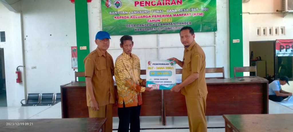 Bertempat di Balai Desa Dander, Selasa, 19 Desember 2023, , jam 09.00 WIB dilaksanakan agenda pencairan Bantuan Langsung Tunai Dana Desa (BLT-DD). Pencairan bantuan bagi keluarga terdampak Covid – 19 ini bersumber dari dana APBN (Dana Desa) yang berjumlah 28 KK Keluarga Penerima Manfaat (KPM) dari beberapa RT yang ada di Desa Dander. Untuk diketahui pencairan BLT DD ini untuk bulan Oktober sampai dengan Desember 2023 dengan besaran bantuan per bulan Rp.300.000, per KPM. Harapannya dengan bantuan ini dapat membantu meringankan beban kebutuhan sehari-hari penerima bantuan tersebut. Bantuan BLT DD tersebut diserahkan secara simbolik kepada perwakilan KPM oleh Kepala Desa Dander atau perangkat desa yang mewakili.