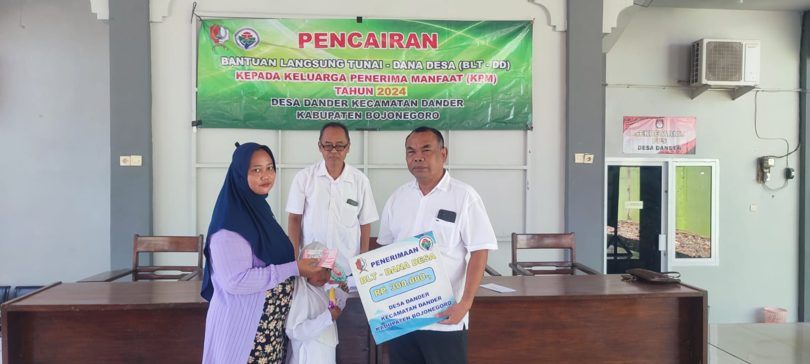 Bertempat di Balai Desa Dander, Jum’at, 18 Oktober 2024, jam 09.00 WIB diselenggarakan kegiatan pencairan Bantuan Langsung Tunai Dana Desa (BLT-DD). Pencairan bantuan bagi keluarga kurang mampu dan untuk mengentaskan kemiskinan ekstrem ini bersumber dari dana APBN (Dana Desa) yang berjumlah 15 KK Keluarga Penerima Manfaat (KPM) dari beberapa RT yang ada di Desa Dander. Untuk diketahui pencairan BLT DD ini untuk bulan September sampai dengan Oktober 2024 dengan besaran bantuan per bulan Rp.300.000, per KPM. Harapannya dengan bantuan ini dapat membantu meringankan beban kebutuhan sehari-hari penerima bantuan tersebut. Bantuan BLT DD tersebut diserahkan secara simbolik kepada perwakilan KPM oleh Kepala Desa Dander atau perangkat desa yang mewakili.
