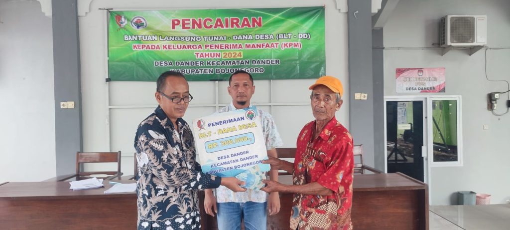 Bertempat di Balai Desa Dander, Jum’at, 6 Desember 2024, jam 09.00 WIB diselenggarakan kegiatan pencairan Bantuan Langsung Tunai Dana Desa (BLT-DD). Pencairan bantuan bagi keluarga kurang mampu dan untuk mengentaskan kemiskinan ekstrem ini bersumber dari dana APBN (Dana Desa) yang berjumlah 15 KK Keluarga Penerima Manfaat (KPM) dari beberapa RT yang ada di Desa Dander. Untuk diketahui pencairan BLT DD ini untuk bulan November sampai dengan Desember 2024 dengan besaran bantuan per bulan Rp.300.000, per KPM. Harapannya dengan bantuan ini dapat membantu meringankan beban kebutuhan sehari-hari penerima bantuan tersebut. Bantuan BLT DD tersebut diserahkan secara simbolik kepada perwakilan KPM oleh Kepala Desa Dander atau perangkat desa yang mewakili.