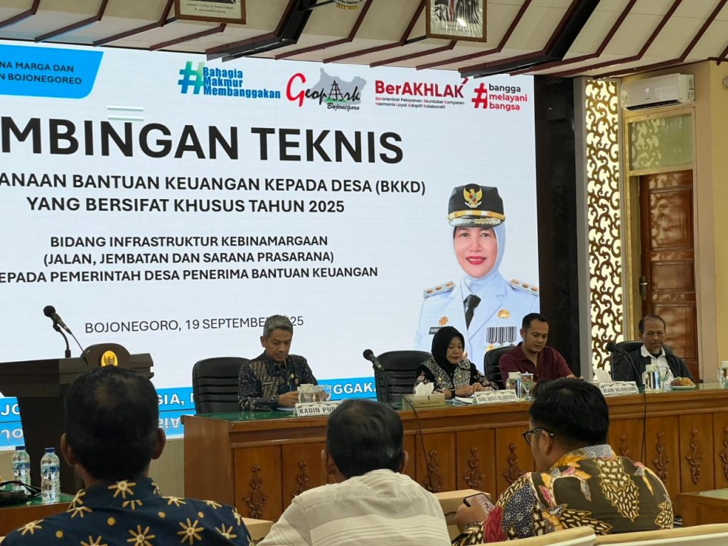 Bertempat di Ruang Angling Dharmo Lantai 2 Pemerintah Kabupaten Bojonegoro, Jum’at, 19 September 2025 Dinas Pekerjaan Umum Bina Marga dan Penataan Ruang Kabupaten Bojonegoro menyelenggarakan bimbingan teknis Bantuan Keuangan Khusus Desa (BKKD) tahun 2025 yang terdiri dari kegiatan pembangunan jalan dan jembatan.