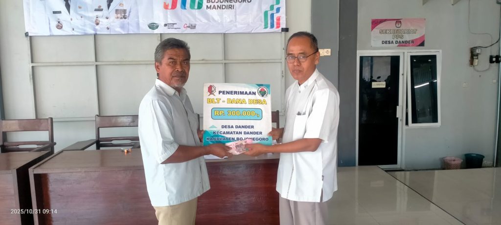 Bertempat di Balai Desa Dander, Jum’at, 31 Oktober 2025, jam 09.00 WIB diselenggarakan kegiatan pencairan Bantuan Langsung Tunai Dana Desa (BLT-DD). Pencairan bantuan bagi keluarga kurang mampu dan untuk mengentaskan kemiskinan ekstrem ini bersumber dari dana APBN (Dana Desa) yang berjumlah 10 KK Keluarga Penerima Manfaat (KPM) dari beberapa RT yang ada di Desa Dander. Untuk diketahui pencairan BLT DD ini untuk bulan September dan Oktober 2025 dengan besaran bantuan per bulan Rp.300.000, per KPM. Harapannya dengan bantuan ini dapat membantu meringankan beban kebutuhan sehari-hari penerima bantuan tersebut. Bantuan BLT DD tersebut diserahkan secara simbolik kepada perwakilan KPM oleh Kepala Desa Dander atau perangkat desa yang mewakili.